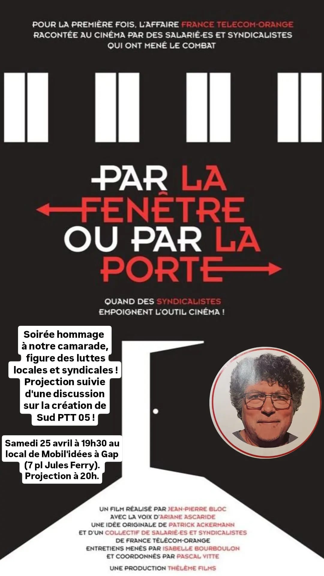 Nous organisons à Gap le 25 avril, date où Jean Marc serait parti à la retraite, une soirée hommage avec projection du documentaire « Par la fenêtre ou par la porte » fait par des syndiqués de France Telecom, étant donné qu’il a créé la branche locale dans le 05. D’autres personnes ex France Télécom seront présents.